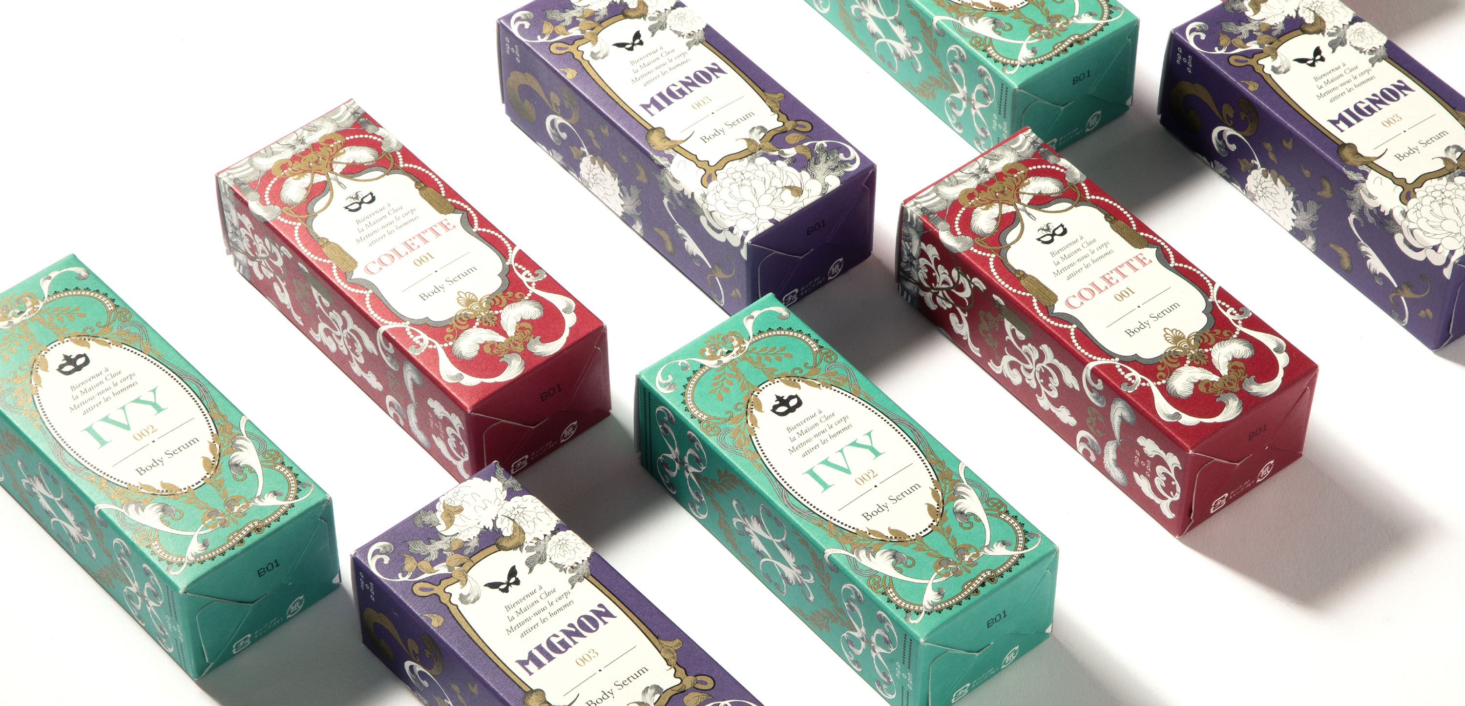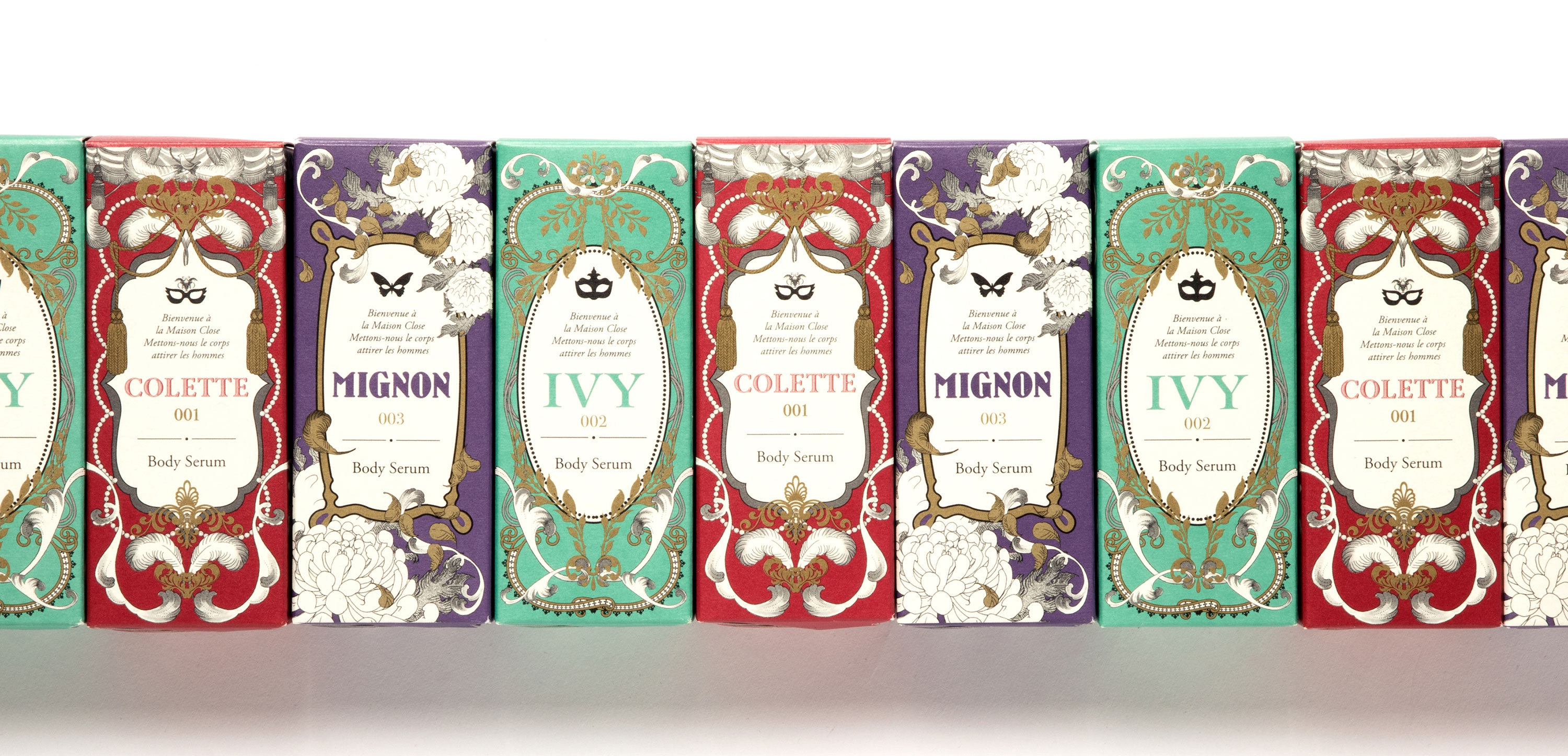 三越伊勢丹のプライベートブランド「nippoppin」と安野モヨコ氏の「鼻下長紳士回顧録」のコラボから生まれたボディスラムのパッケージデザイン。古き良き時代のパリの娼館を舞台とする作品の艶やかな世界観を継承しながら、登場するキャラクターの特徴を商品とパッケージに反映した。