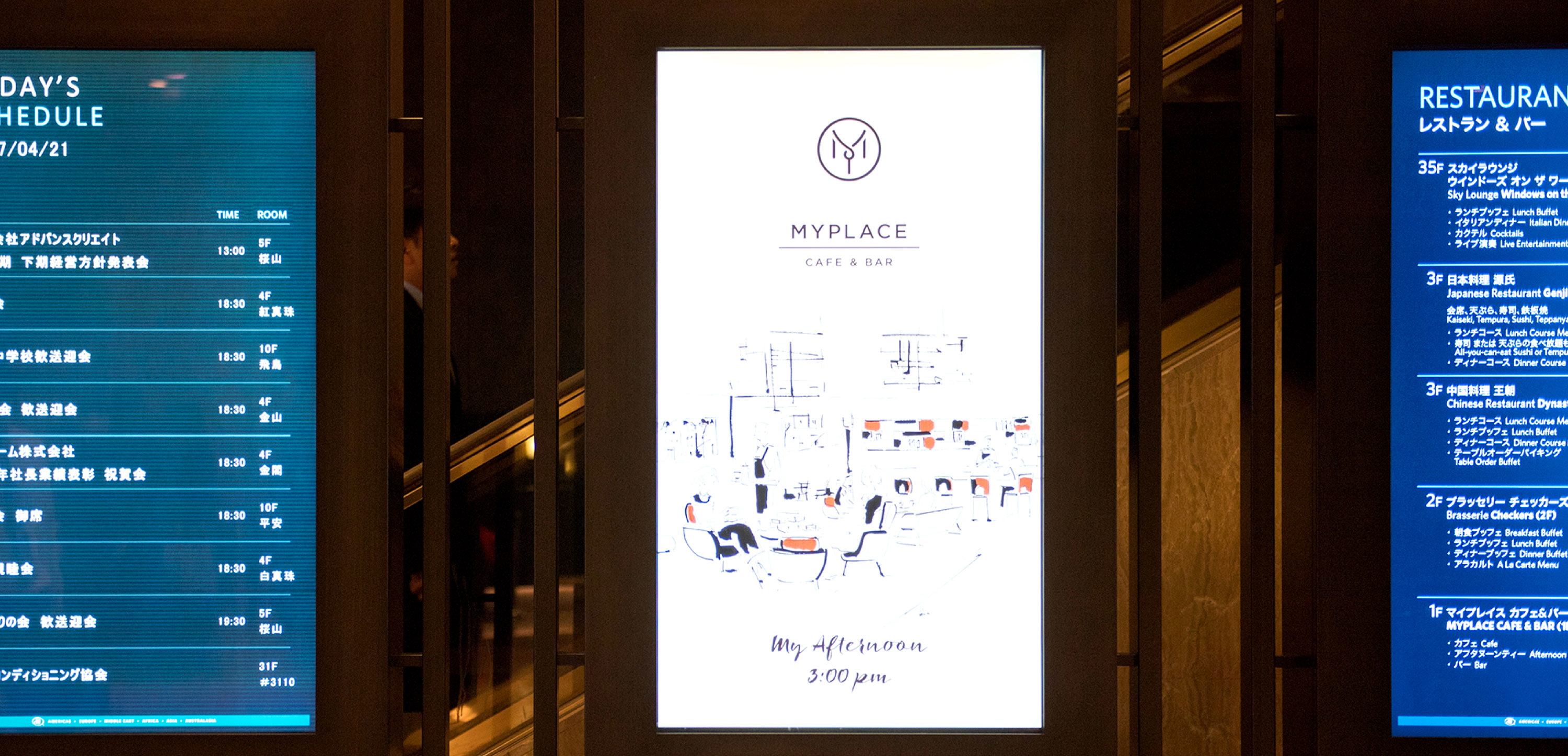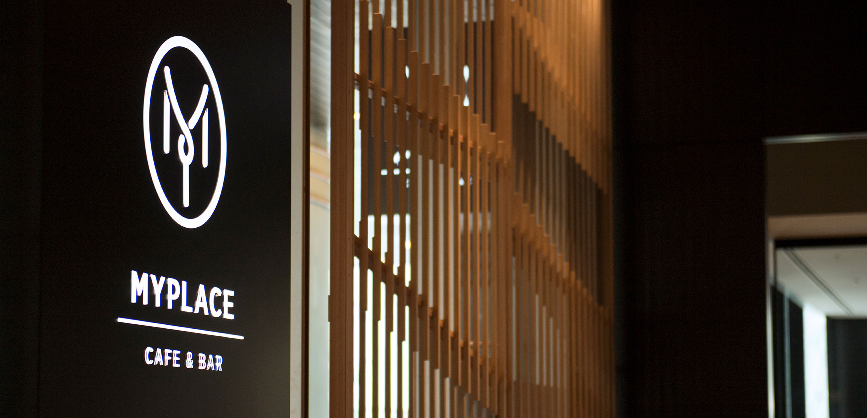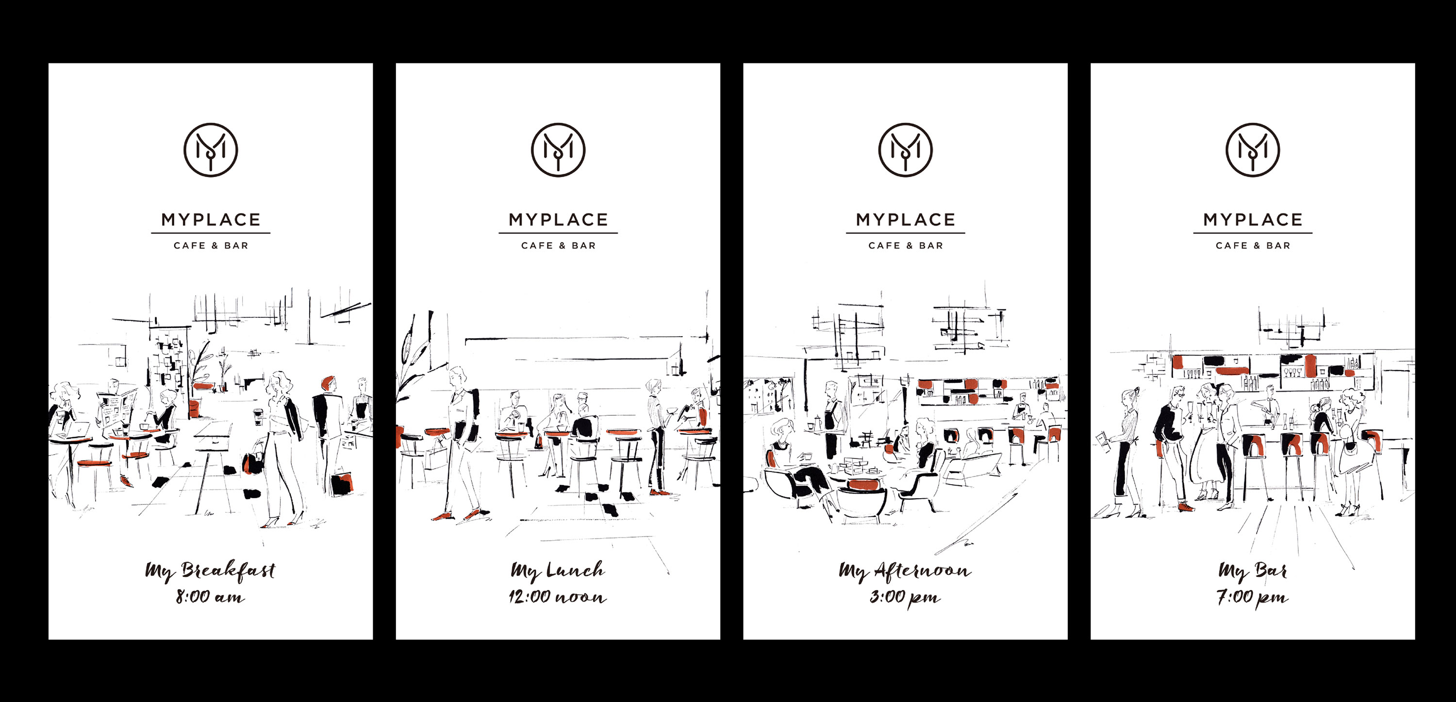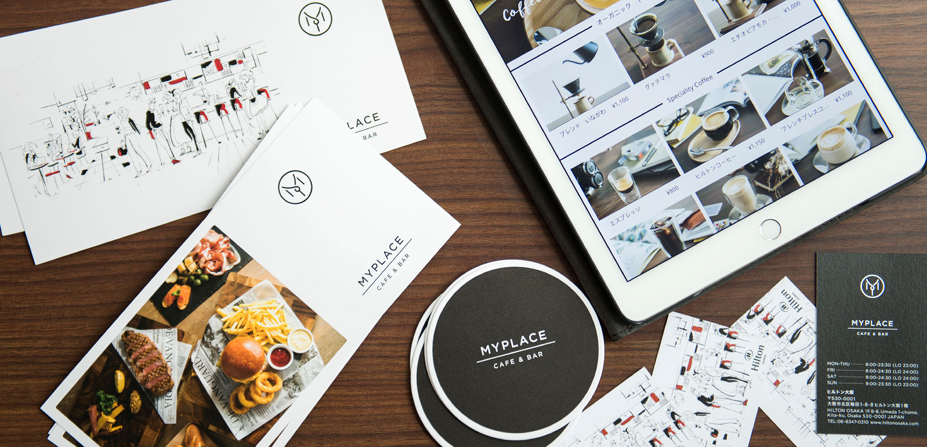 ヒルトン大阪にあるカフェ&バーのロゴとツールデザイン。自宅でも職場でもない、自分だけの心地よいサードスペースに刻印を押すようなイメージで「MY」をロゴ化。カフェからバーに時間ごとに移り行く様をイラストで表現し、PRツールとして展開した。
