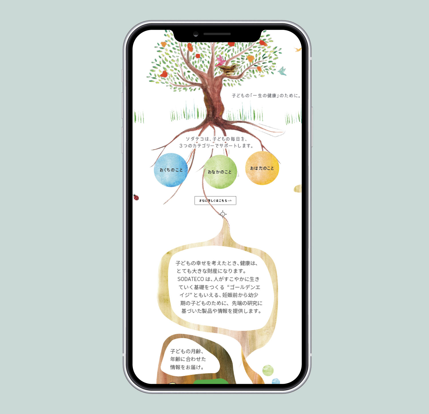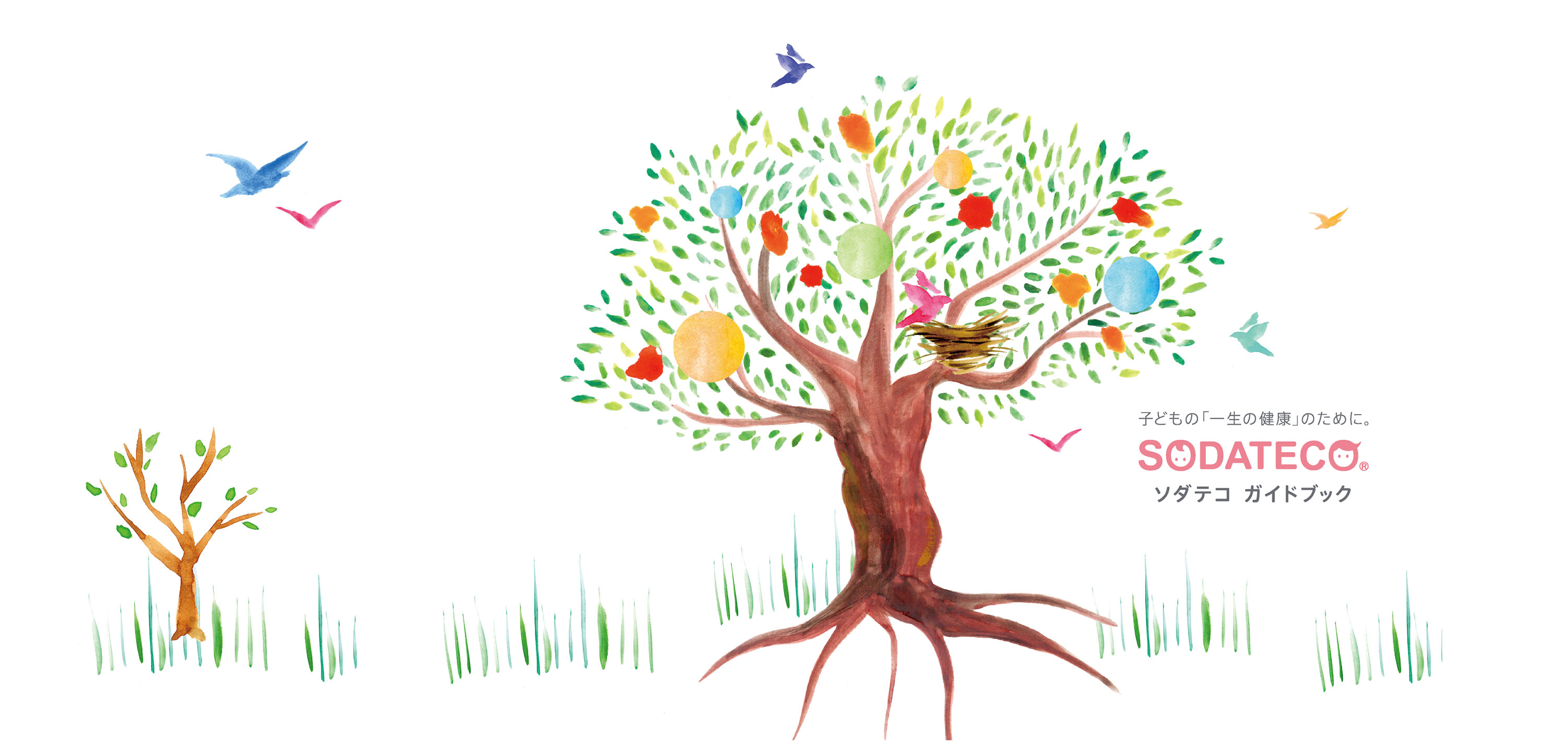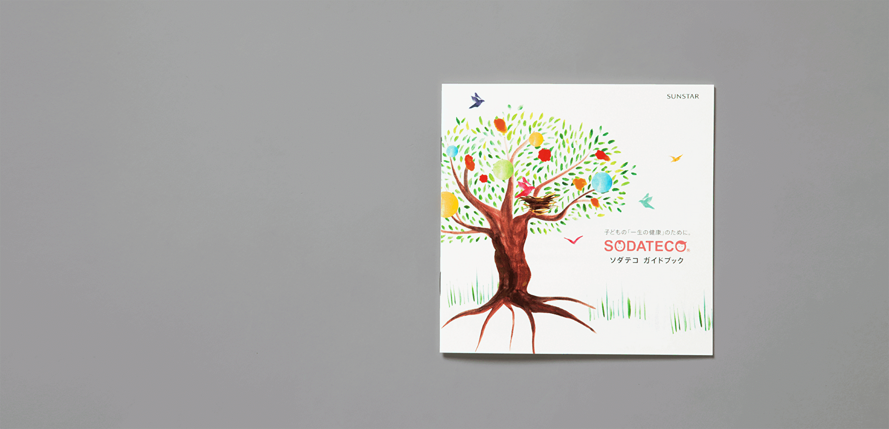 妊娠前から幼少期の子供の健康をサポートする商品ブランドのアートディレクションを担当。ブランドのKVとして「ソダテコの木」を作り、木の成長にあわせて展開するブランドブックを制作。すくすく育って実がなり、鳥が集まる木に、健やかな成長への願いを込めた。
